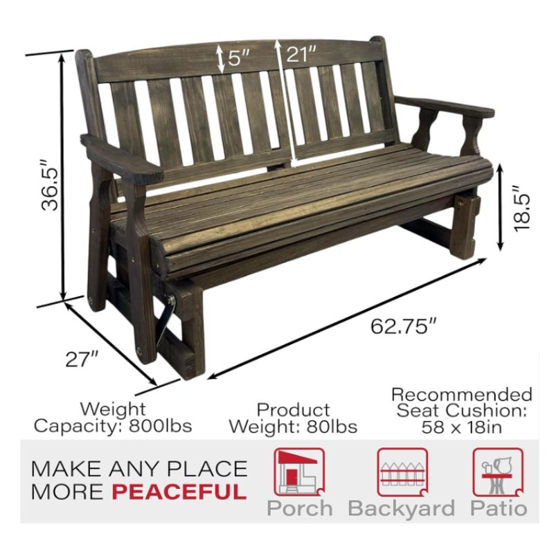 Built to support up to 800 pounds, this bench-style glider offers generous space for two adults while maintaining sturdy, balanced motion. The eco-friendly soy-based Dark Walnut stain enhances the natural wood grain while providing long-lasting UV protection. Rust-resistant yellow zinc-plated hardware ensures durability through changing seasons.