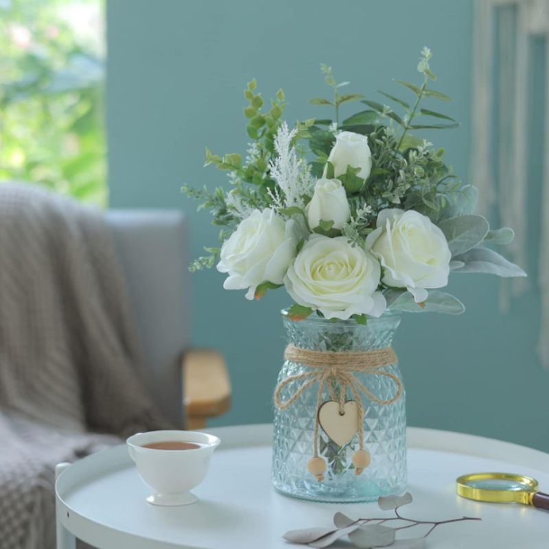 This elegant artificial floral arrangement brings a fresh, timeless look to your home—without the upkeep. Featuring soft white silk roses, eucalyptus stems, and flocked greenery, the bouquet is arranged in a decorative glass vase accented with twine and subtle charm details.