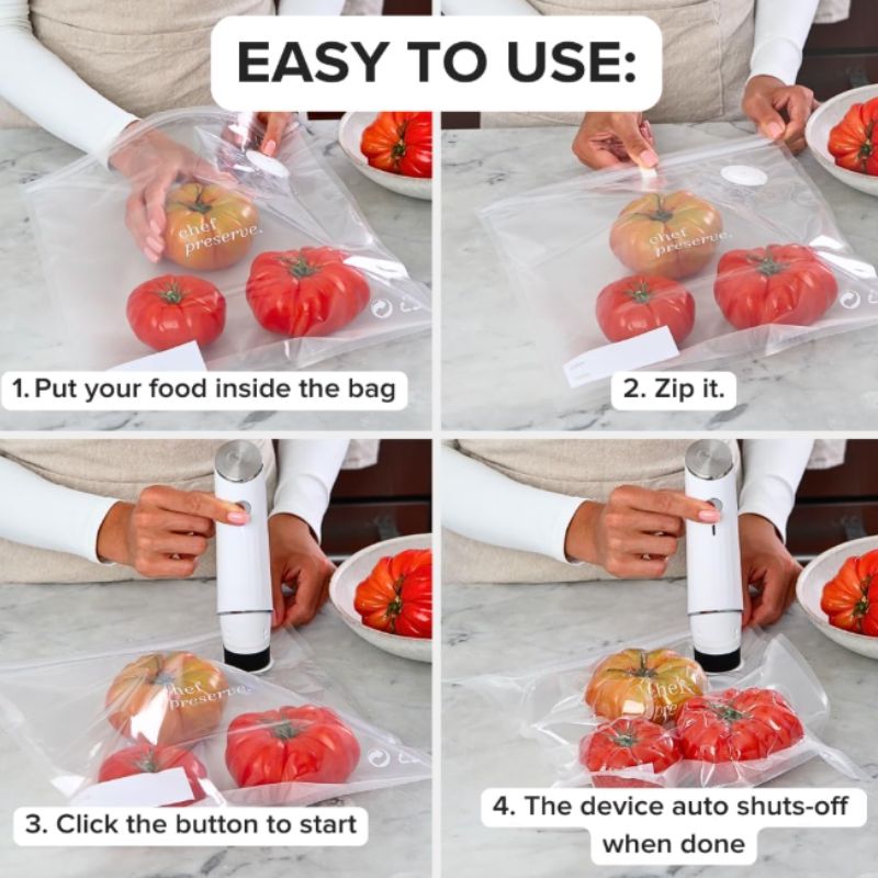 Unlike traditional countertop vacuum sealers, this handheld version is lightweight, cordless, and easy to store. Just place your food in the reusable bag, zip it closed, press the button, and let the sealer do the work. It automatically shuts off when finished, making it simple even on busy days.