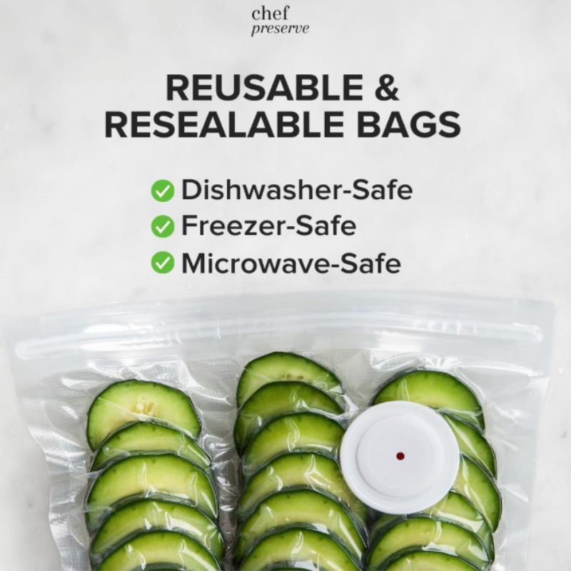 The reusable bags are dishwasher-safe, freezer-safe, and microwave-safe, making them perfect for meal prep, leftovers, snacks, and produce. Whether you’re storing fresh vegetables, meats, or dry goods, this vacuum sealer helps preserve flavor and texture while keeping your kitchen organized.